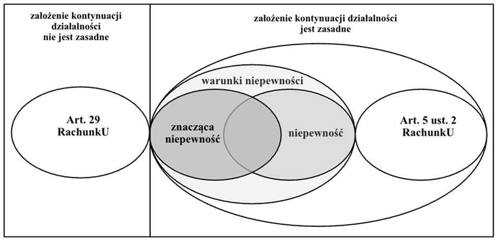 Wyróżnia się cztery stany niepewności w sprawie tego, czy firma jest zdolna do dalszego działania: od całkowitej pewności (Art. 5 ust. 2 UoRach), przez niepewność i niepewność znaczącą, aż po stan pewności co do braku zdolności do kontynuacji (Art. 29 UoRach) . Brak zdolności, często nazywa się w skrócie ZKD (litera Z od “zagrożenia” lub “zakończenia”).
