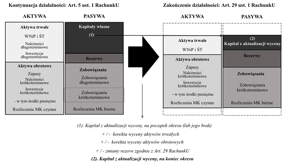 W księgach rachunkowych przedsiębiorstwa którego dotyczy ZKD, dokonuje się wyceny wszystkich aktywów według cen sprzedaży netto i zmienia kwalifikację wszystkich zobowiązań na krótkoterminowe. Ponadto obowiązkowo tworzy się rezerwę na koszty zaniechania działalności. Różnice z wycen aktywów i pasywów przy otwarciu ZKD odnosi się na kapitał z aktualizacji wyceny. Może powiedzieć, że bilans w stanie ZKD ulega jakby konwersji i kompresji.