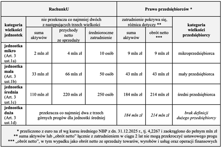 Poniższa tabela przedstawia zestawienie progów wielkości jednostek w RachunkU z odpowiadającymi im kategoriami w Prawie przedsiębiorców.